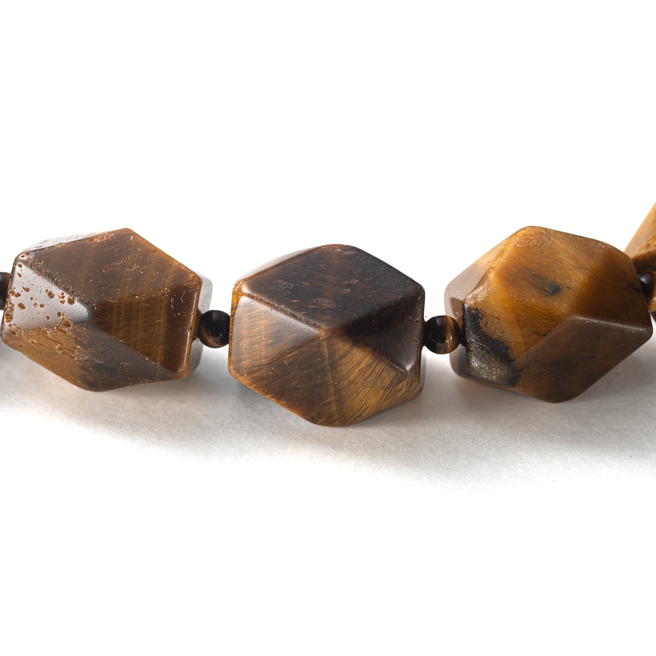 シャープなカットが生み出す光のきらめきと、タイガーアイ特有の縞模様が重厚な存在感を与えます。